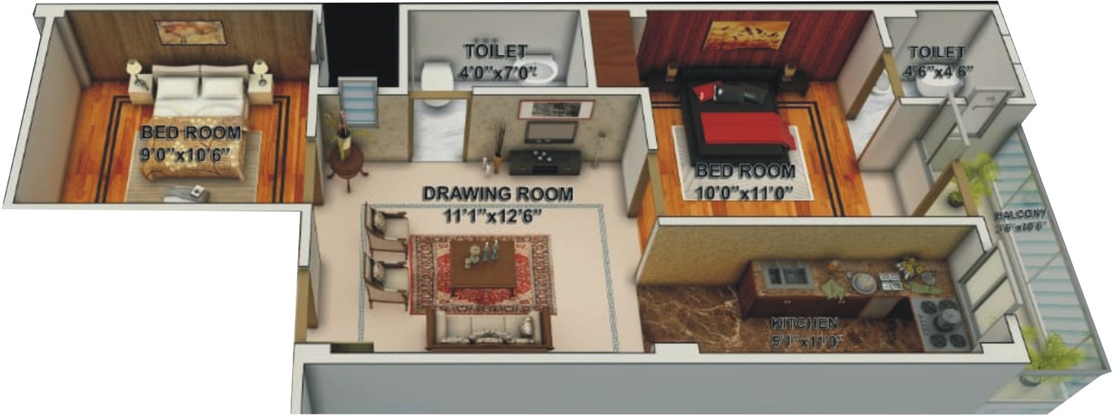 Flooring: Vitrified tiles flooring in the Drawing room, Bedroom & Kitchen Anti-skid Ceramic tiles flooring in bathroom and balconies.